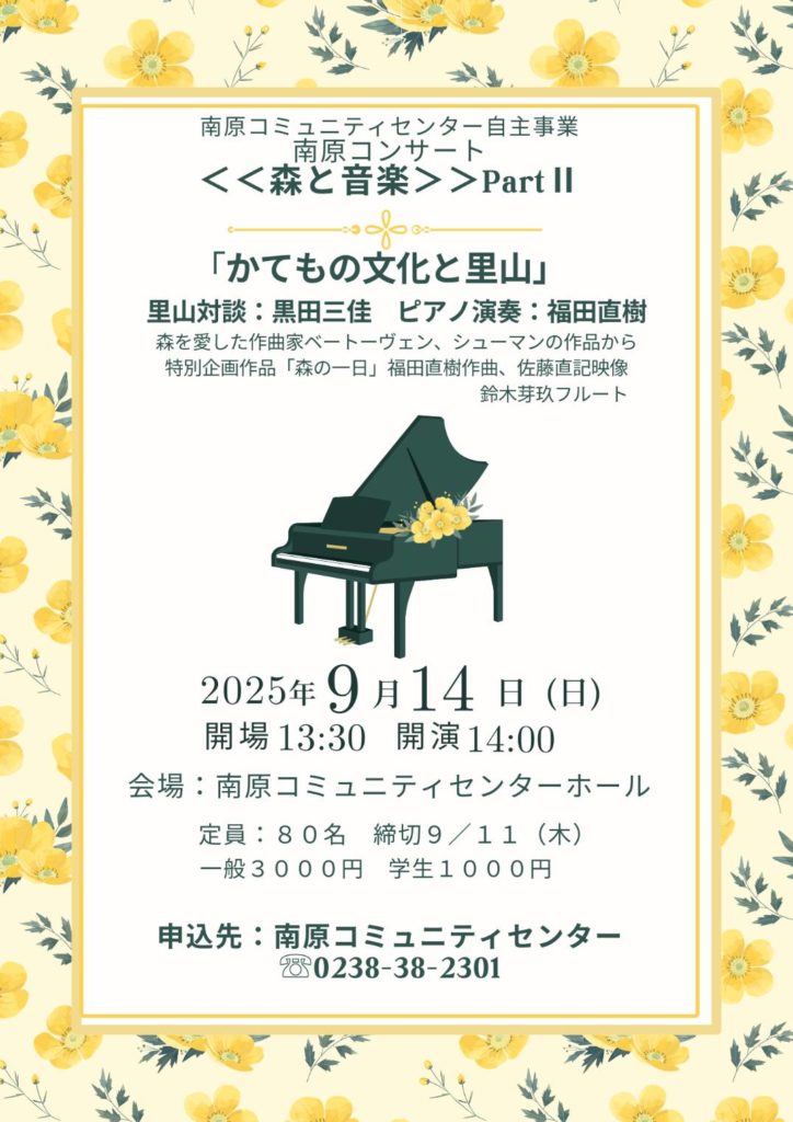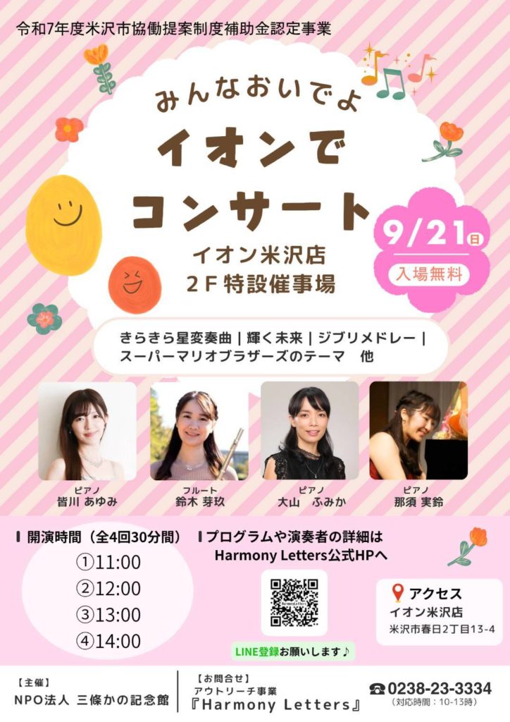 このコンサートはNPO法人三條かの記念館主催の令和7年度米沢市協働提案制度補助金認定事業です。